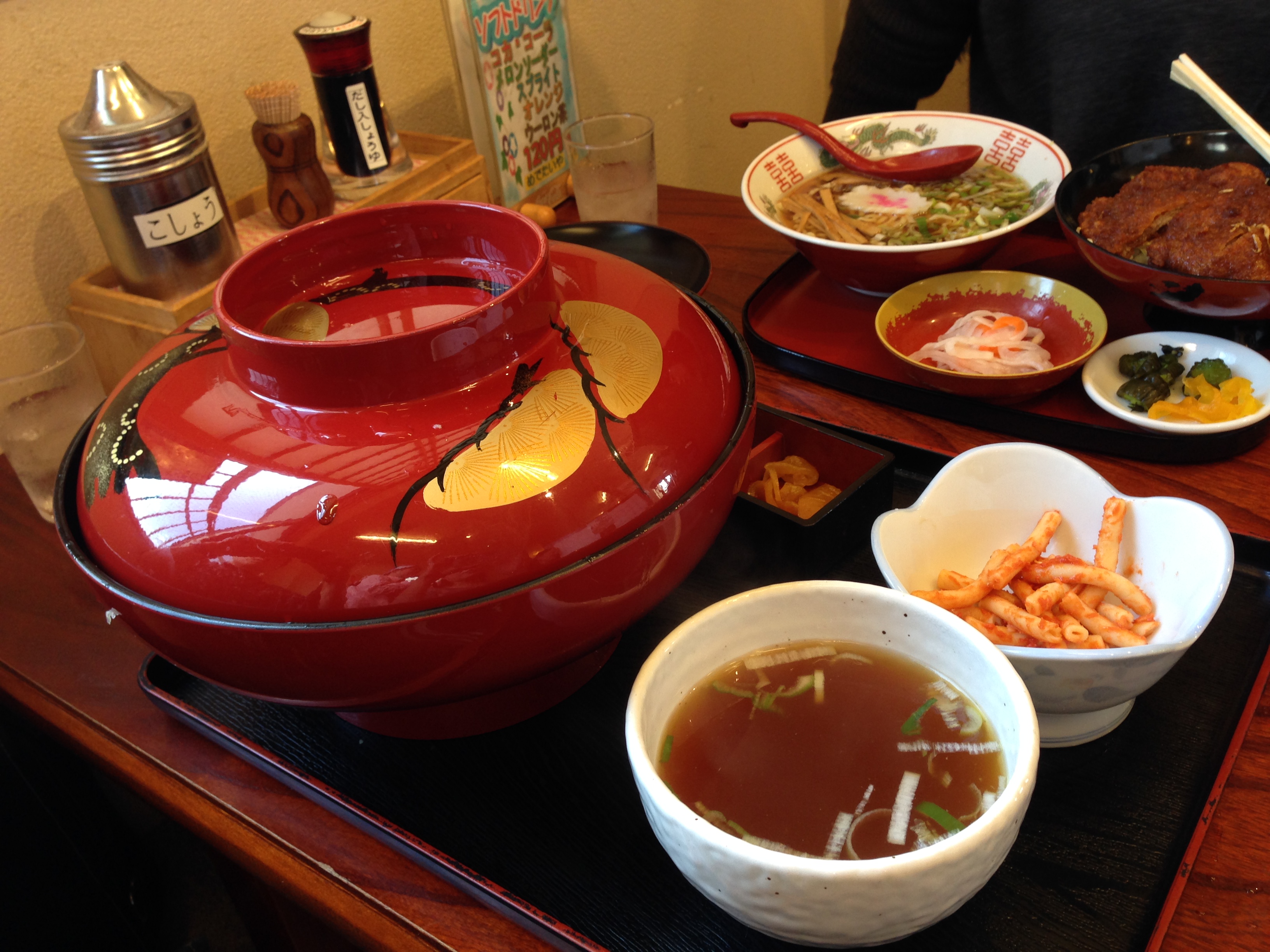 隊列組んで 昼食会場まで♪ 会長が予約してくださってたそうなので席の確保安心(´▽`) 人気店〜連休〜〜〜 (案の定。開店前なのに並んでました!) 会長さま感謝☆ って、、、 (若干)地元だけど不案内の我が家(爆) 滅多に行かない観光地、会津 地図手離せませんw 城下町は一方通行多いしさ。。。 しかもw ナビありません Dが以前言ってた ○万円のナビ こと、ワタクシw なんとか地図みて ルート決定(*^m^*) やっぱ一通多いわ~ おかげで変なルート( ̄o ̄;) Dったら 当日私に(ナビ担当)言うから〜(爆) 事前に言ってくれれば、、、 もう少しテンパらずに済んだわよ。。。 (結果オーライ。雑ですみませんw) なんとか無事にw 辿り着いたお店でランチ 実は会長とDがアレコレ相談してた時点で(私の中ではw)ケテー? 会津若松B級グルメ カレー焼きそば (「ソースカツ丼の会」、とともに「カレー焼きそばの会」、もあるらしーw) カレー焼きそば ルーツは『トミーフード』さん?? (残念ながらお目にかかったことありません) に、 これまたB級グルメ ソースカツ コラボw この大きさ(伝わらないかもですがw) お皿、30センチくらいはあったよーな、、、 見た瞬間 ムリ! って思いましたけどねww Dにスライド決定w 美味しかったのですが、、、 焼きそばにね〜 ニラ が、、、 ニラとカレー 合わない。。。 (個人的意見) ニラ、好きじゃなかった私w そんなわけで 思ったより食べられず Dにw あ、Dは 洗面器のような 大名ソースかつ丼(だっけ?) オーダー (写真撮ってない。いや。Dは撮ったが取り込んでないw) 洗面器くらいの軽くトラウマになりそーな器w ご飯2合くらい? (追記) 軽く完食してから コレ、 (私の残した分ね) チャレンジしたが~~~ さすがに 想定外 だったのか 残しちゃった 申し訳ないっす・・・ ニラが入ってなければもうすこーーーし食べれたかも。。。 我が家のメニュー以外も ミニじゃないだろ 的w 大盛りなお店だったのか? 実はネットで見ました・・・ が、、、 事前情報拡散せずw すみません。。。 なんとなく皆さん ヤラレ気味に、、、 オフ会のネタとしは正解 ですがねw(悪魔ww) 気を取り直し♪ お店を後にしたメンバーが向かったのは レクw 武家屋敷〜 かなーーーーり! お腹いっぱいでした・・・っ! がっ。 見所いっぱいの武家屋敷☆ (ほぼ地元なのにお初w) レクとしては 大正解♪ (案外歩きましたw) 続くw PR 恒例(?)