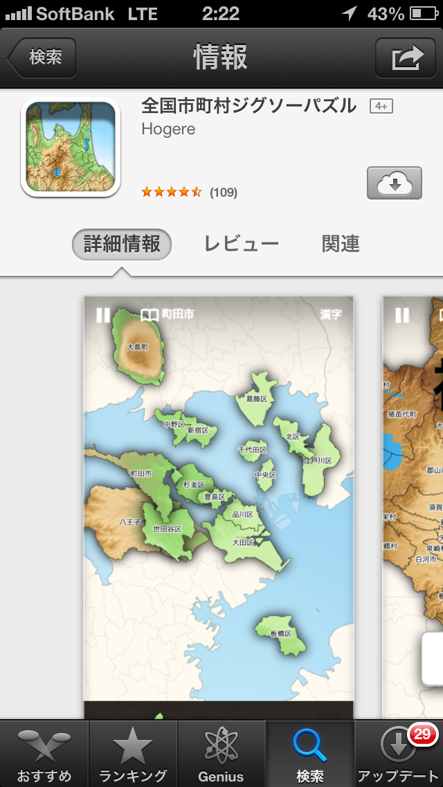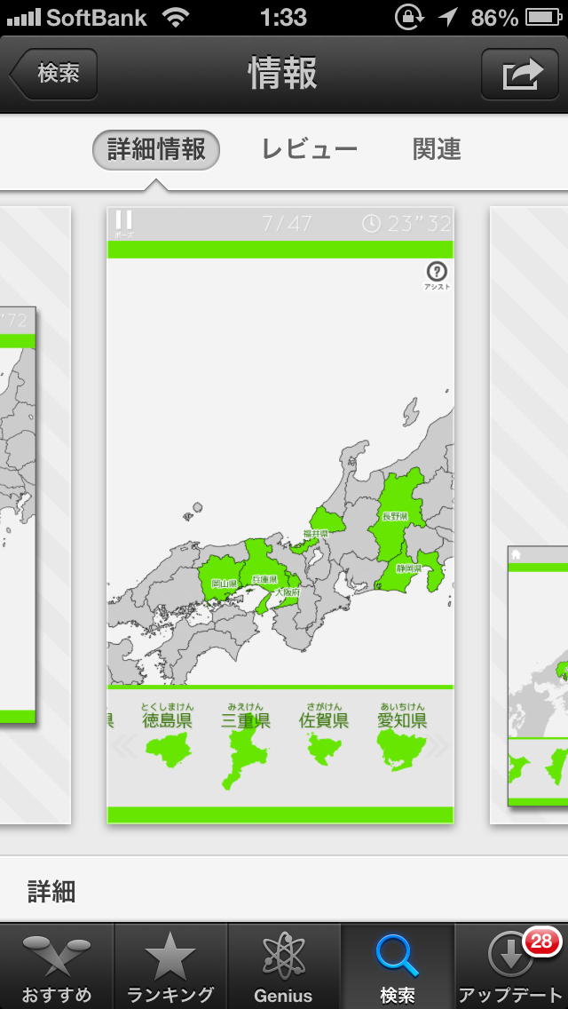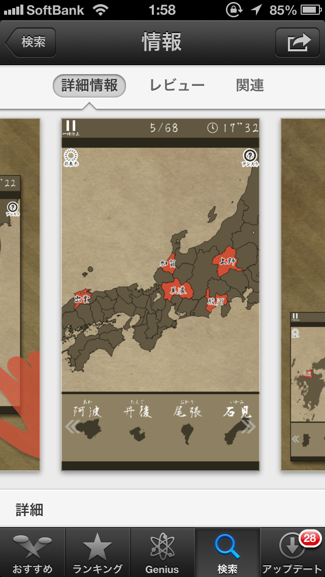 入院なら ひまつぶし 的に DLしたアプリ ナゼか 日本地図 あー私。。。 いわゆる地理 苦手です。。。 ひまつぶし (平仮名で書くと、ひつまぶしに見えるの私だけ?!) あんど 実益(大人なのに学習とかw) 兼ねるならww ですw イマイチわかりにくいですが 白地図うめる感じっす 境界線と県名あるバージョン(トレーニング) 県名のみバージョン(ベーシック) 何も無いバージョン?(エキスパート) みたいな感じ。 地理苦手なのでどれも手探りw もいっこ 旧国名で 江戸時代? 的な 甲斐とか信濃、美濃 美作 などw こちらも基本的には日本地図と同じ感じ (トレーニングとかベーシック) エキスパートはハードル高すぎw 時代劇や時代小説好き(*^^*ゞ でも 込み入った戦国時代はちょっと(^^;; 江戸なら 武鑑欲しかったw あ、家紋もね~ ちょっとマニアックな時代小説には大名家の家紋とか、、、 出てくるんですよ。。。 家紋で何家とか、、、 ムリw 県名の方は2分台? 藩名の方は3分? だったかなw それよりハードル高いのはっ! 市町村レベルのやつ。。。 数県やってみたが、、、 難しい(-""-;) 地元より隣県のがはやい(笑) 地理トクイなDに唯一勝ったのは 地元のみ(T▽T) グランドスラムの中で