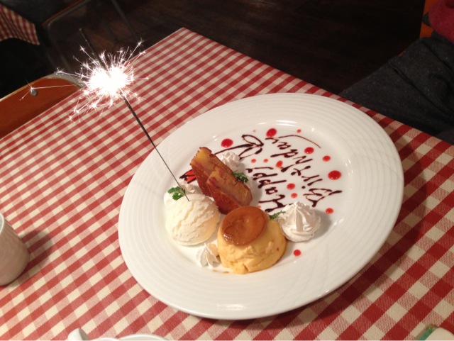 毎月、 『月替わり』のハンバーグがあるのでw ついつい通ってしまい、数年?(笑) で、今月も~ って、今月のは、、、 私じゃなくDが注文したので、、、 手元に写真がナイ(* ̄□ ̄*; ↑写真は 私が注文した ハンバーグ&エビフライ~♪ 余談ですが私はエビフライとか海鮮系のフライはお醤油でいただくのが好きでして ソース持ってきてくれたのですが お醤油所望w お味、薄かったですか? って、お店の方にいらん心配かけてしまった<(_ _)> カキフライ&エビフライは タルタル+お醤油が、、、 とても好きなのです(^¬^) で、 なんだっけ。。。 あ、月替わりハンバーグ! まだ市場にあまり出回ってない なんとか豚のハンバーグ・・・ 登米産乳酸豚 あ、そうそう! ソレw Dのひとくちもらってみたけど 嫌味の無い美味しい豚さんでした☆ 豚肉100%って モノによっては変に豚臭いとゆーか、、、 ちょっと苦手(〒_〒) なのだが この豚さん そんな心配一切無く 美味しかった~♪ ちなみにお米もすげー美味しい。。。 Dは黙って2回はお代わり(無料♪) で、こちらのお店。 メルマガ会員になると お誕生日の月に デザート盛り合わせ いただけるのです~♪ ちょっと恥ずかしい花火のおまけ付きw チョコレートとベリーのソースで描かれた文字&お花も素敵(* ̄。 ̄*) フロア担当の可愛いおねーさんが 無愛想な○○ってシェフ(?)が 珍しくお花描いてくれました! って(^ー^* ) さすが常連?(爆) んーーー 見た目ゴツイDのためにお花?! 爆笑w メッセージにお名前とか? っても聞かれたけどwww さすがに恥ずかしいので辞退(*≧m≦*) 楽しいお誕生日(その2) でした☆ 数日前